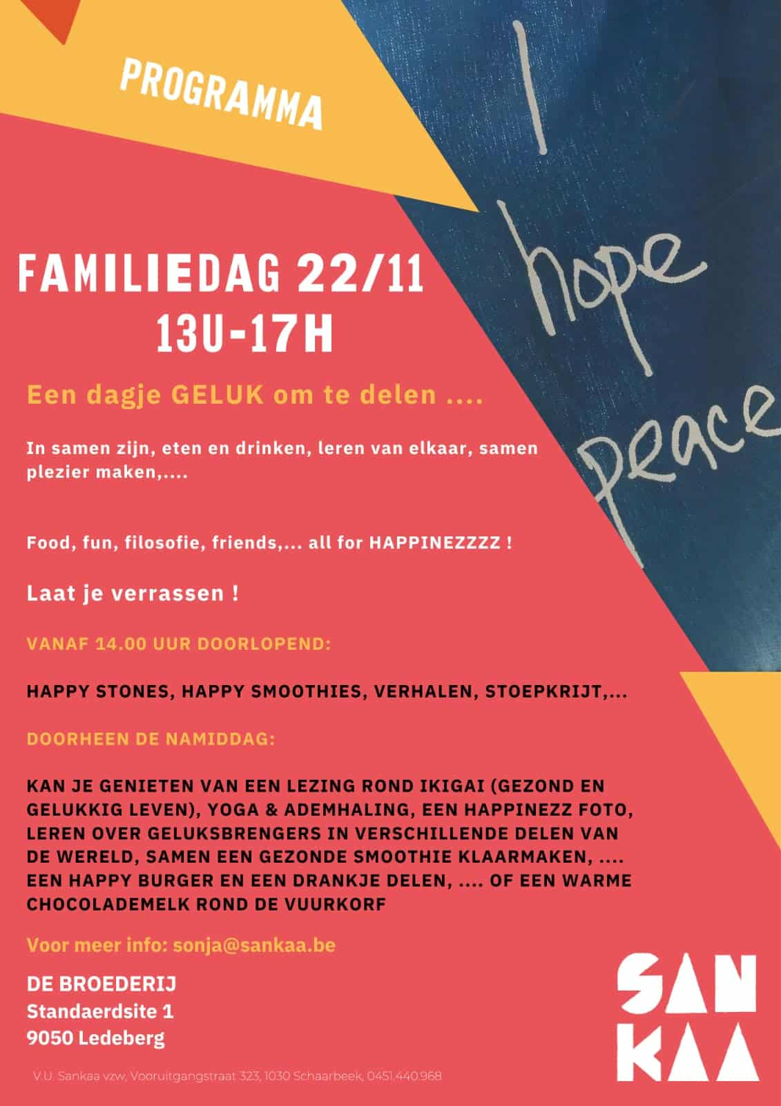 Wij willen jullie, jullie leden en hun familie graag uitnodigen op 22 november op de Sankaa familiedag.
